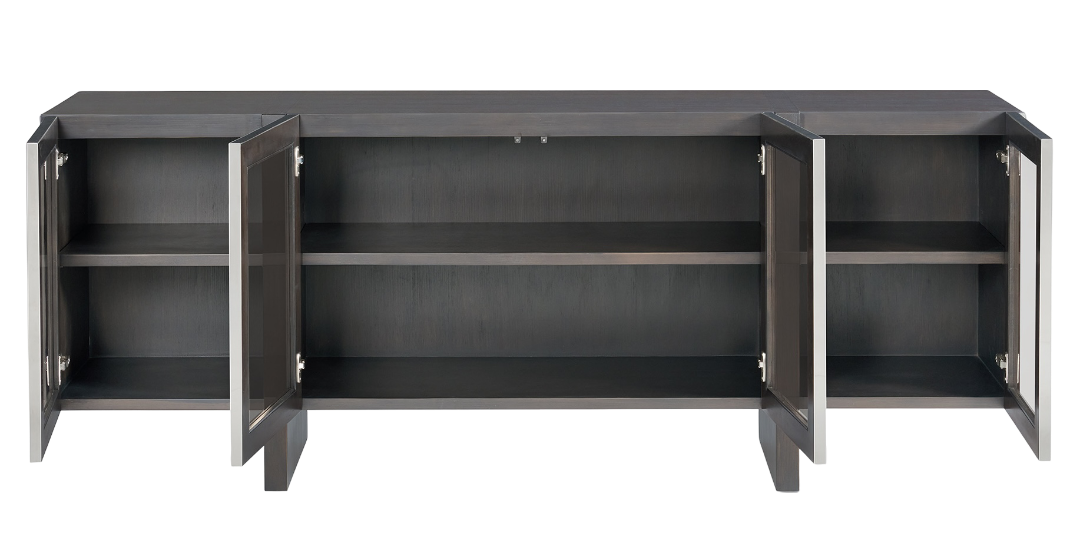 A tribute of functional simplicity, the Andrea Sideboard boasts a perfectly scaled shape. A fluid integrated double base becomes the platform for a floating storage cabinet featuring smoke glass doors.
