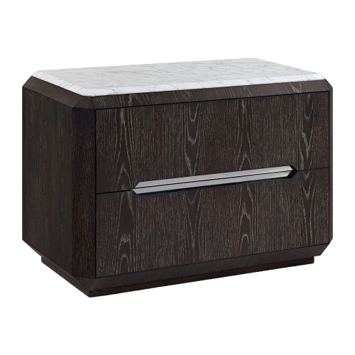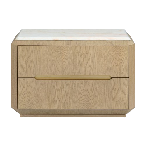 A cut above; Inspired by modern semi-precious jewelry-like silhouettes, the Emerald Nightstand evokes the senses with its uncommon faceted form. Designed for ultimate luxury, a storage piece with two generously proportioned suede lined drawers featuring integrated recessed bronze or chrome finger pull hardware. The case is assembled around the natural beauty of its materiality; natural American white oak, polished stone tops and luminous metal detailing.