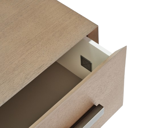 A cut above; Inspired by modern semi-precious jewelry-like silhouettes, the Emerald Nightstand evokes the senses with its uncommon faceted form. Designed for ultimate luxury, a storage piece with two generously proportioned suede lined drawers featuring integrated recessed bronze or chrome finger pull hardware. The case is assembled around the natural beauty of its materiality; natural American white oak, polished stone tops and luminous metal detailing.
