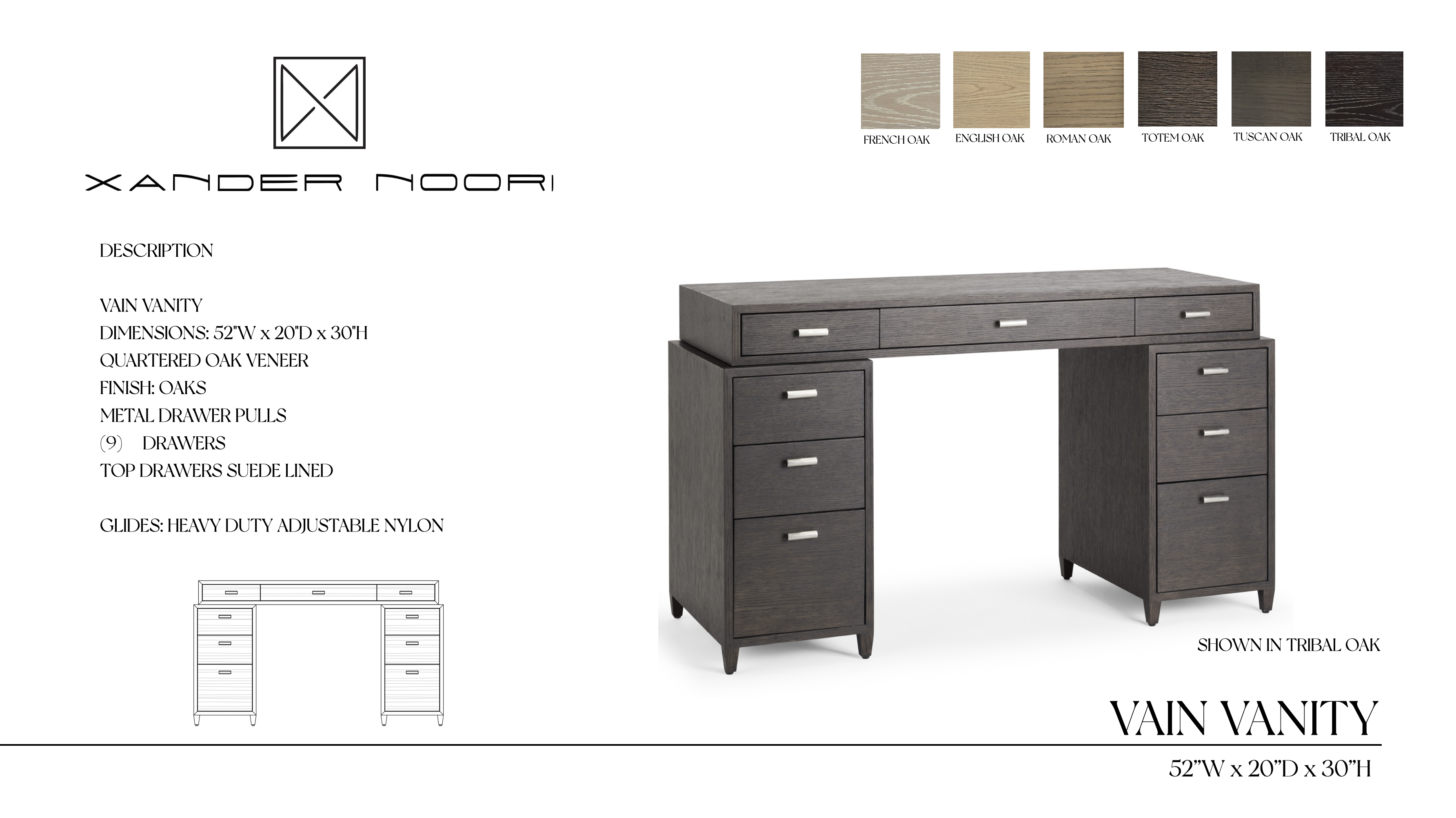 Inspired by the quiet glamour of mid-century dressing rooms, this oak vanity is conceived as a refined architectural composition—pure lines, simplicity of form, warm materiality, and an elegance that feels effortless. Generous, suede-lined drawers offer discreet, abundant storage, transforming the ritual of getting ready into a moment of serenity and elevated beauty.