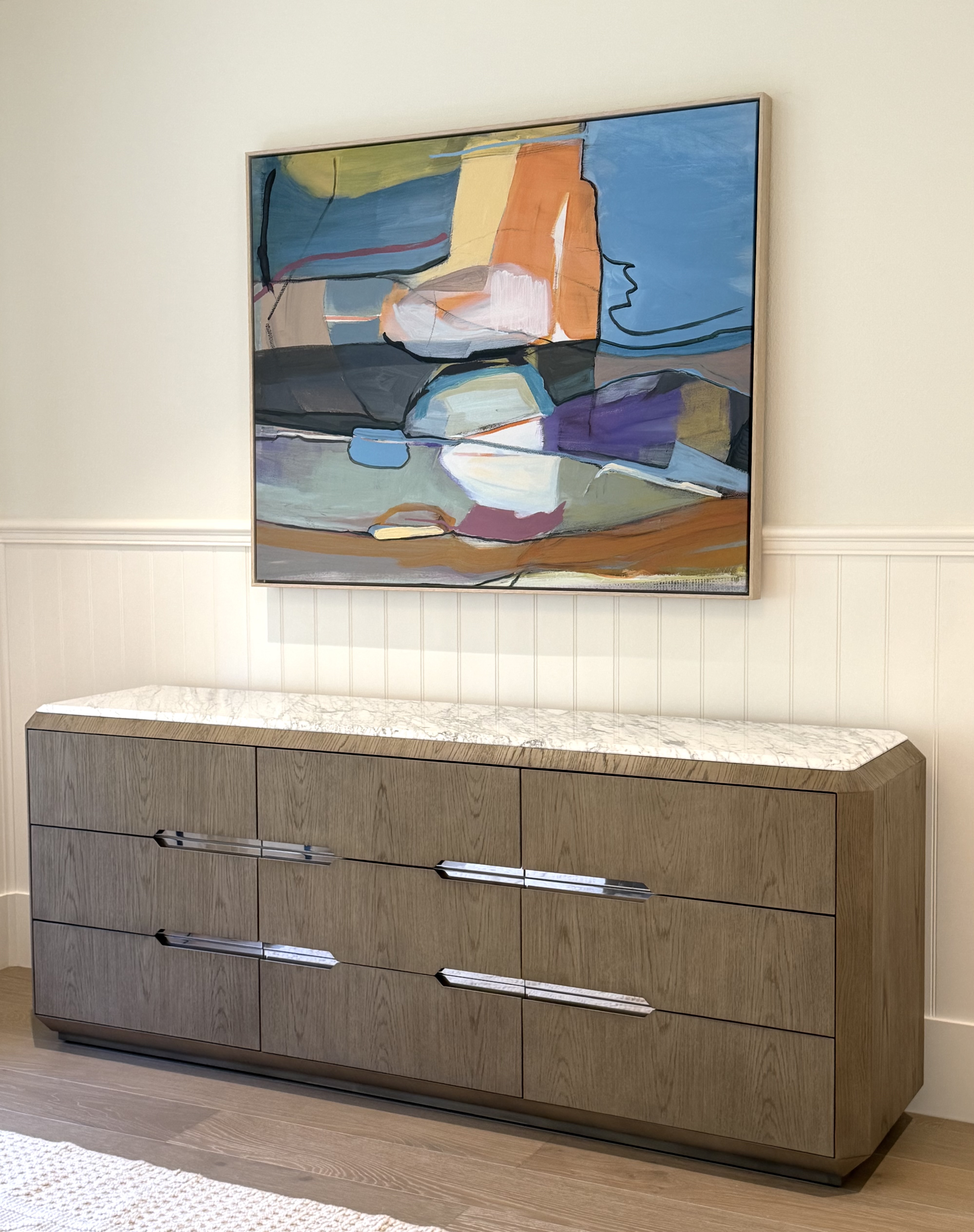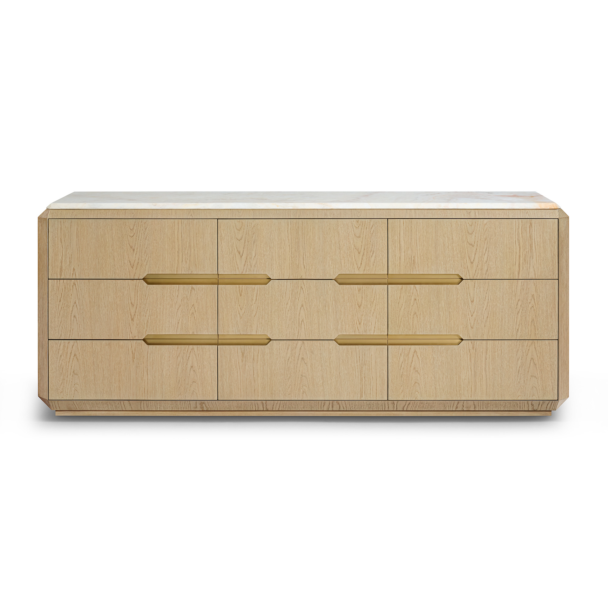 A cut above; Inspired by modern semi-precious jewelry-like silhouettes, the Emerald Dresser evokes the senses with its uncommon faceted form. Designed for ultimate luxury, a storage piece with generously proportioned suede lined drawers featuring integrated recessed bronze or chrome finger pull hardware. The case is assembled around the natural beauty of its materiality; natural American white oak, polished stone tops and luminous metal detailing.